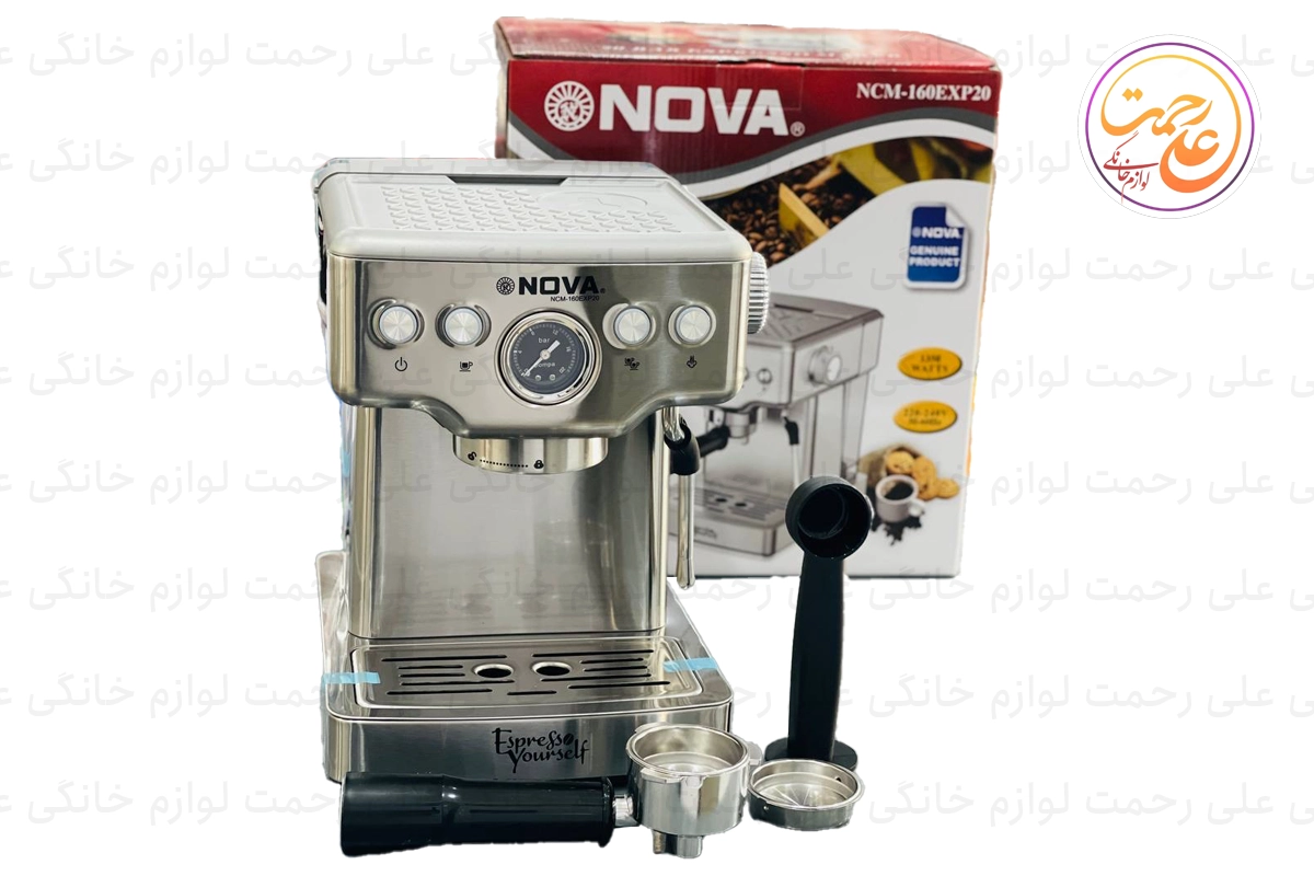 اسپرسو ساز نوا مدل NCM-160EXP20 یک دستگاه نیمهحرفهای و پرقدرت با توان 1350 وات و فشار بخار 20 بار است که برای تهیه انواع نوشیدنیهای بر پایه قهوه، مانند اسپرسو، کافه لاته، کاپوچینو، موکا و شیر گرم بسیار مناسب است. این دستگاه مجهز به پمپ فشار ULKA و بویلر از جنس آلیاژ آلومینیوم است که دمای پایدار و کافی را برای عصارهگیری کامل از قهوه تضمین میکند.