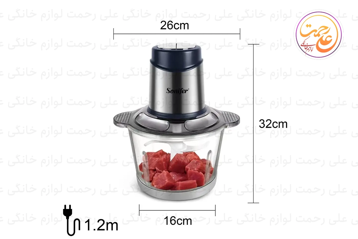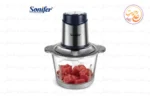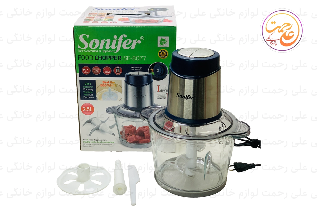 خرد کن سونیفر مدل SF-8077 با توان 400 وات و کاسه 2.5 لیتری شیشه‌ای، دارای تیغه‌های استیل ضد زنگ و قابلیت تنظیم دو سرعت، مناسب برای خرد کردن گوشت، سبزیجات و هم‌زدن تخم‌مرغ است.