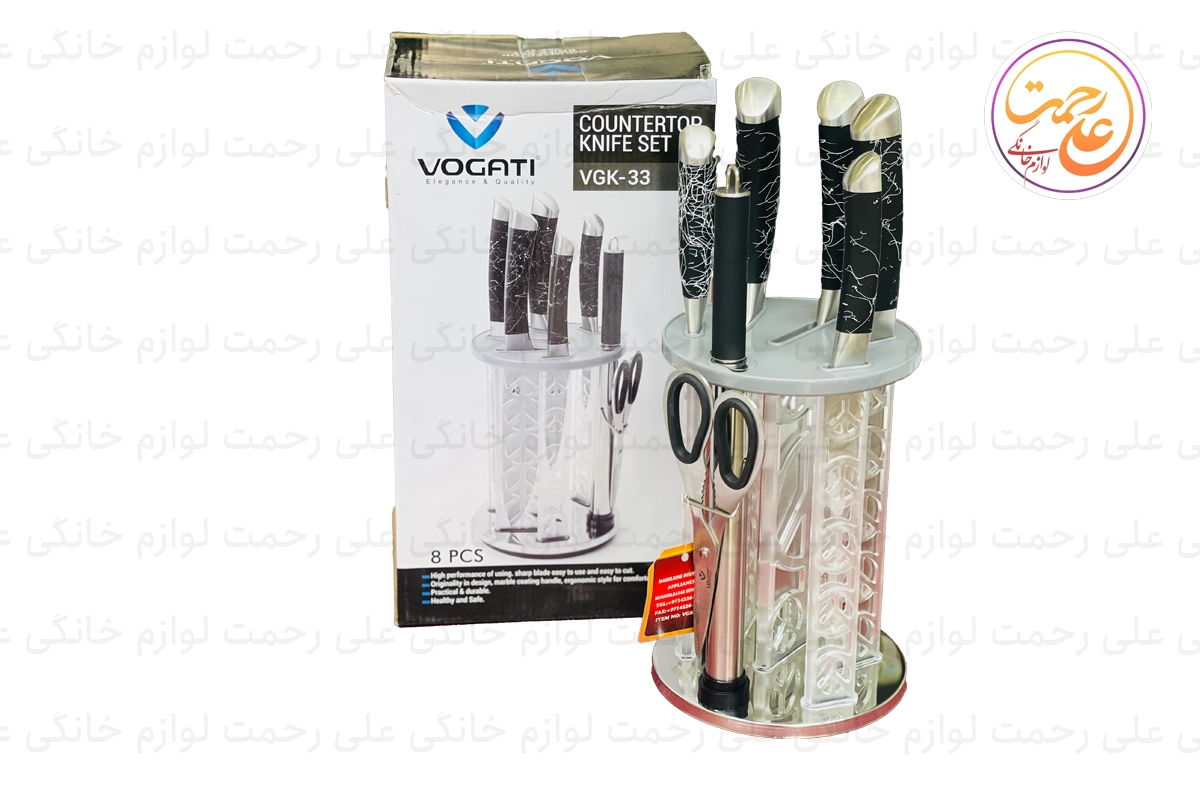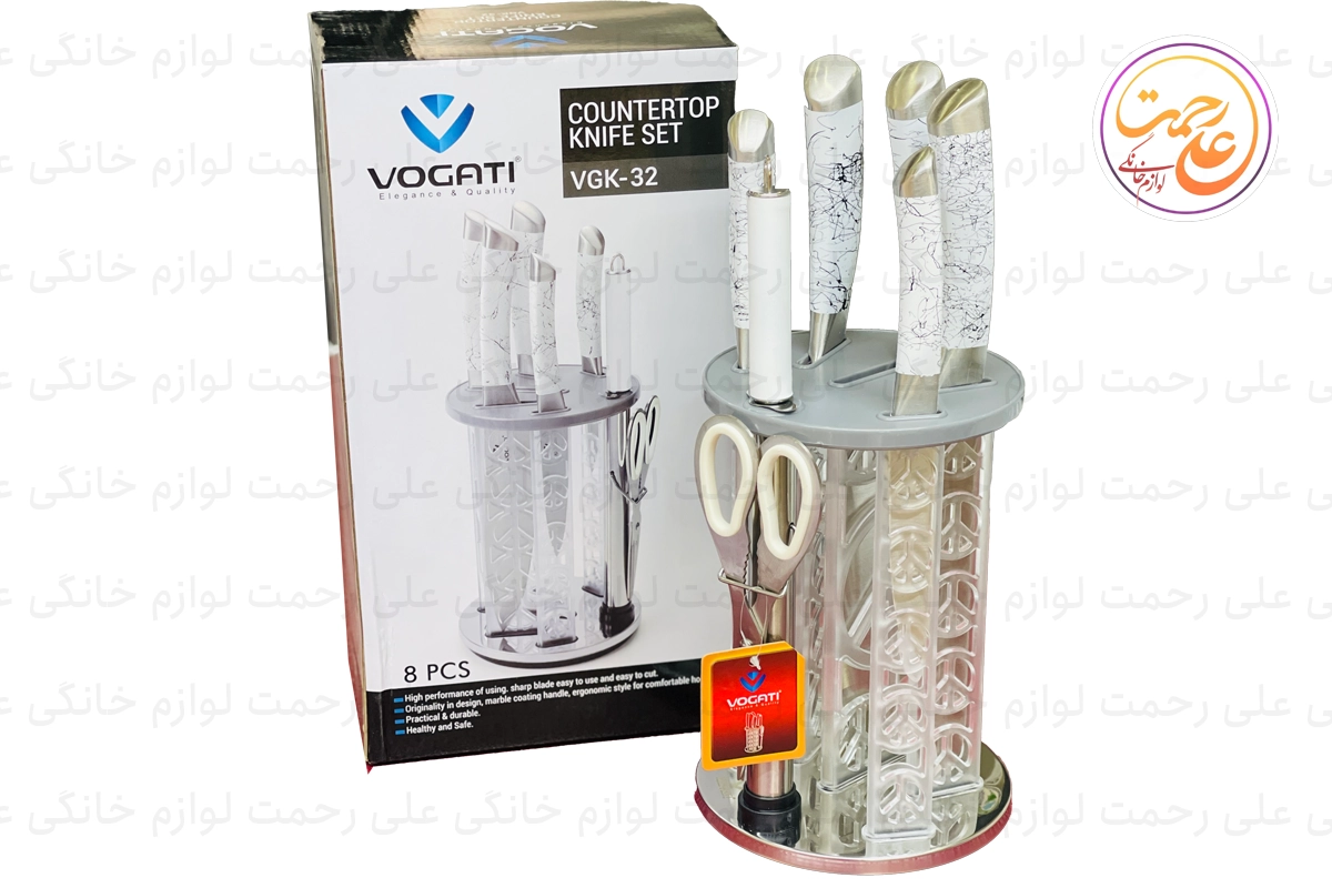 سرویس چاقو وگاتی 8 تکه مدل VGK-32 یک انتخاب ایدهآل برای آشپزخانههای مدرن است که نیازهای مختلف برش و آمادهسازی غذا را پوشش میدهد. این ست شامل چهار عدد چاقو در اندازههای متنوع، یک ساطور برای کارهای سنگین آشپزی، یک قیچی چندمنظوره و یک چاقو تیزکن با کیفیت بالا است. تیغههای این سرویس از استیل ضدزنگ ساخته شدهاند که علاوه بر ماندگاری و مقاومت در برابر زنگزدگی، برشهای دقیق و آسانی ارائه میدهند.
