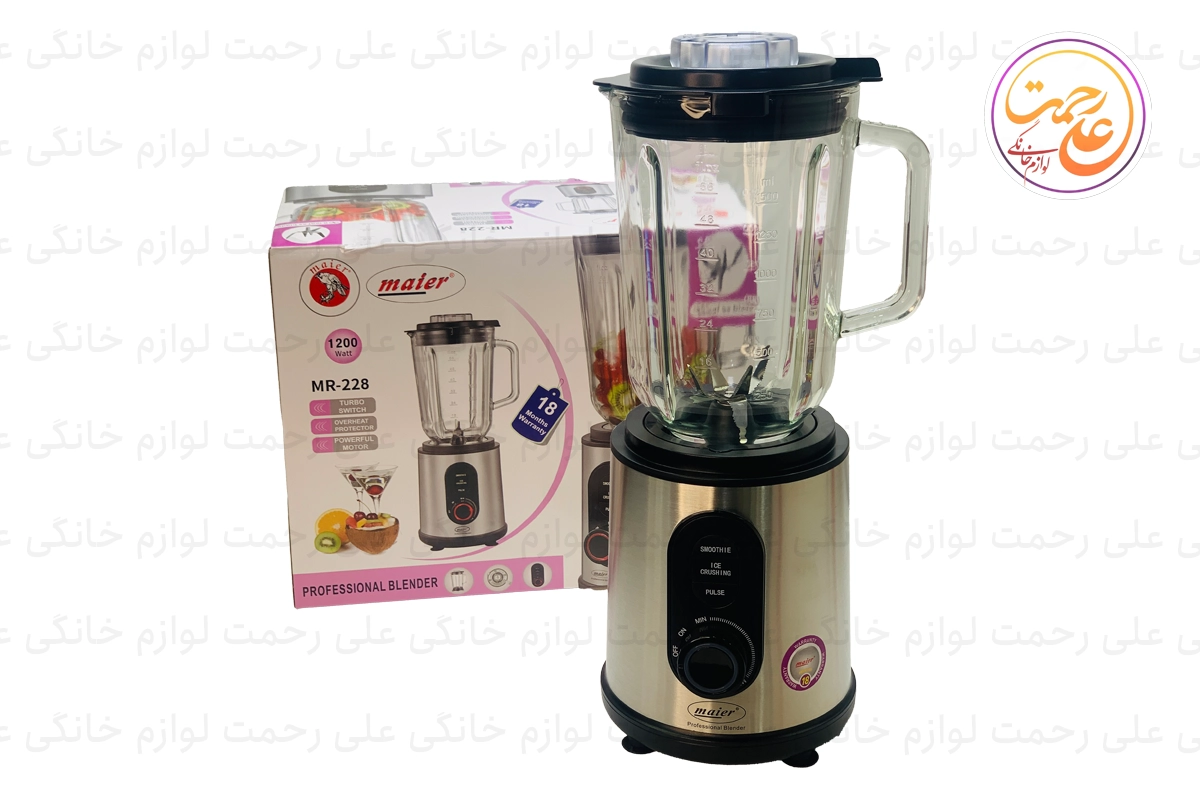 مخلوط کن مایر مدل MR-228 با توان 1200 وات و پارچ شیشه‌ای 1.5 لیتری، مناسب برای تهیه اسموتی، خرد کردن یخ و انواع مواد غذایی با تنظیمات سرعت متغیر و عملکرد پالس است.